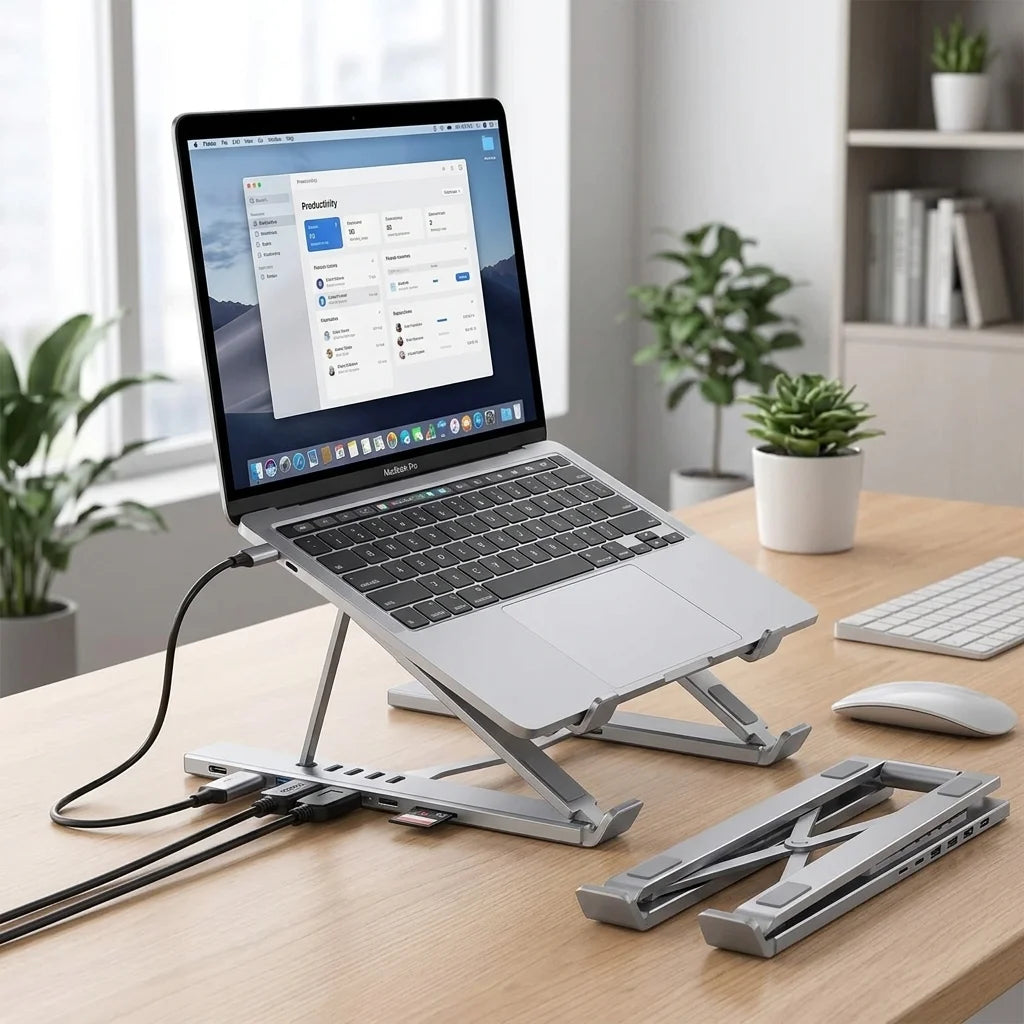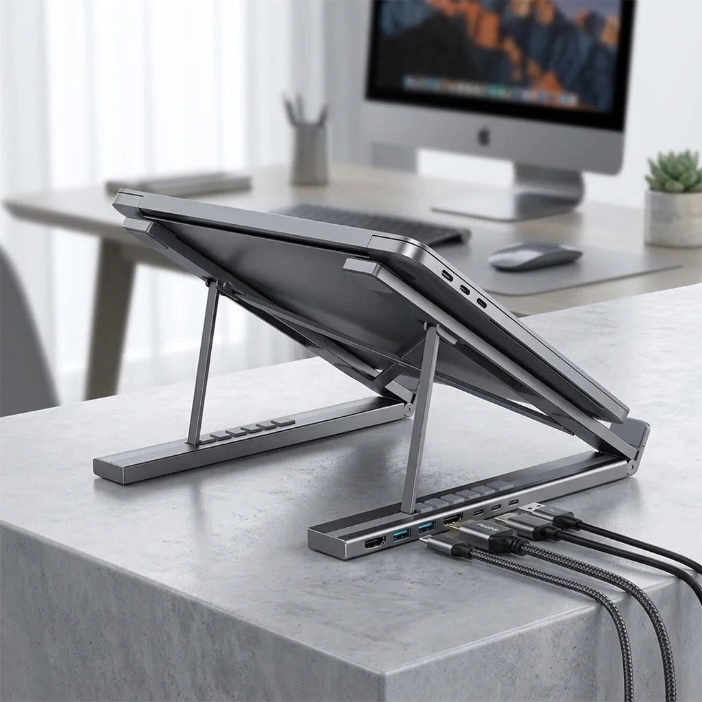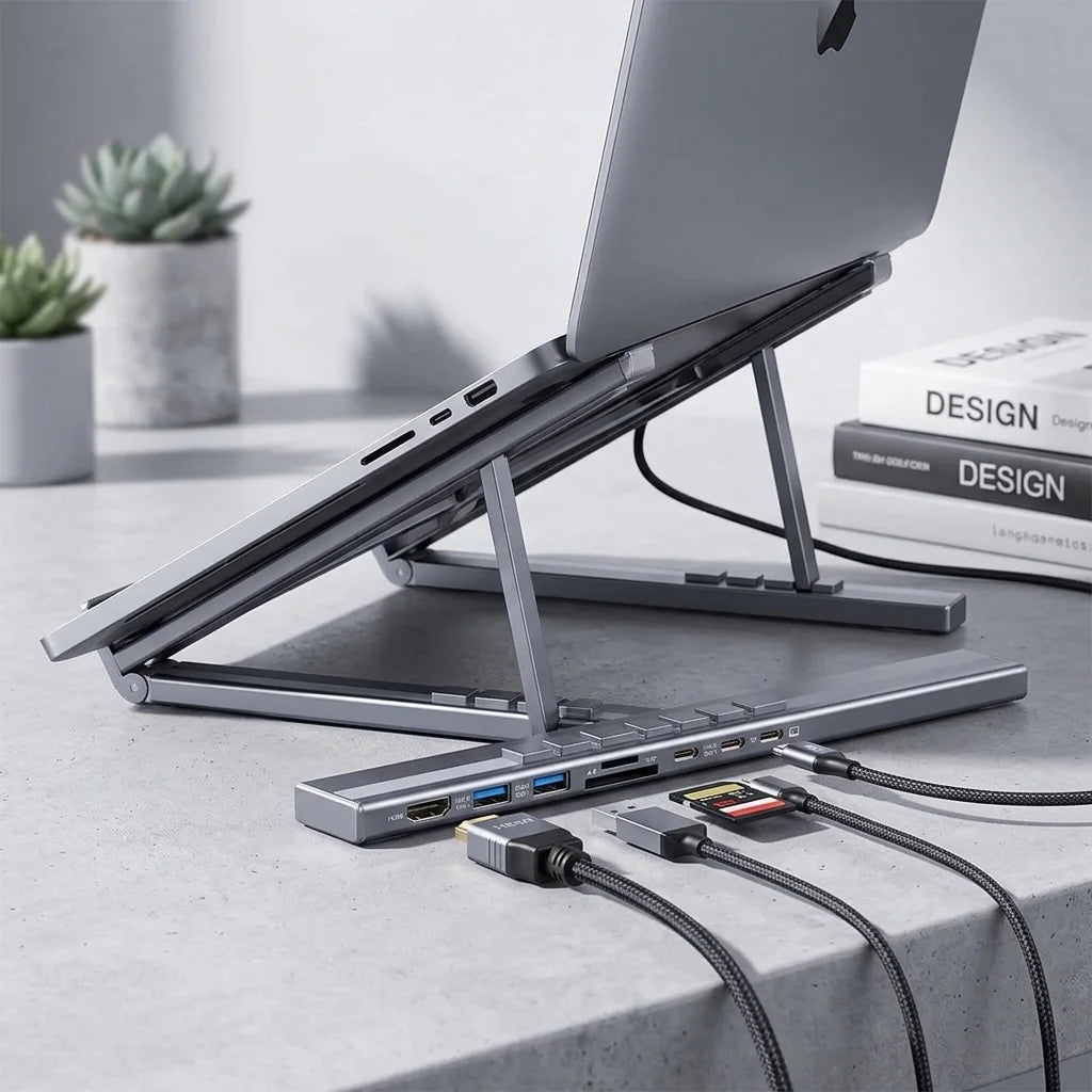 The hub features a clever foldable design that transforms into an ergonomic laptop stand. Simply unfold it to elevate your device, improving airflow, reducing neck strain, and creating a more comfortable workspace. It's innovation at your fingertips!