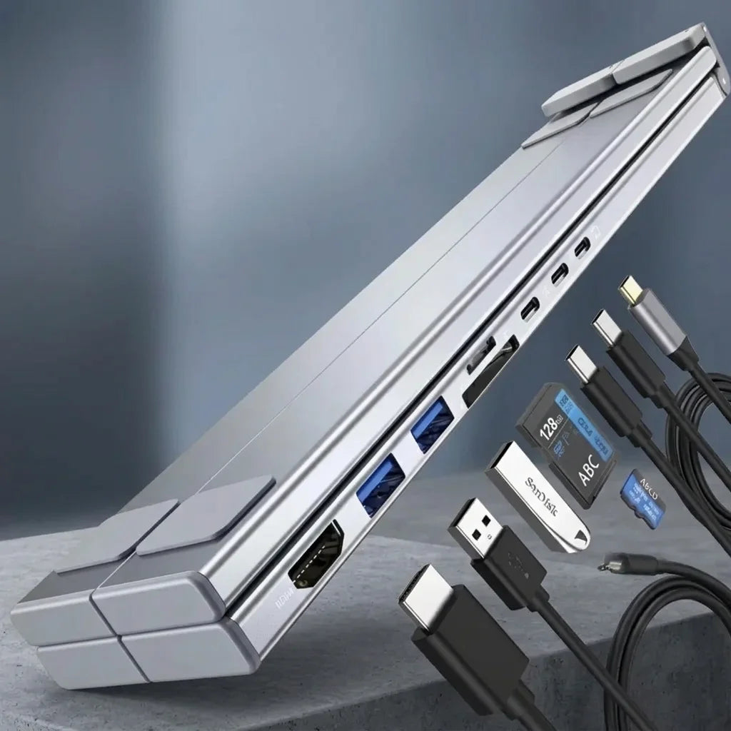 Crafted from premium alloy material, our 8-in-1 USB Hub is built for durability and portability. Its sleek, foldable design makes it incredibly robust and easy to carry, perfect for professionals on the go. Invest in lasting quality!